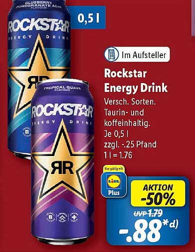 Entdecken Sie das großartige Rockstar Energy Drink Angebot im neuesten Lidl Prospekt. Neben diesem Angebot finden Sie noch viele weitere attraktive Rabatte. Sie können das Rockstar Energy Drink einfach online über die Lidl Website bestellen oder in einem Geschäft in Ihrer Nähe kaufen.