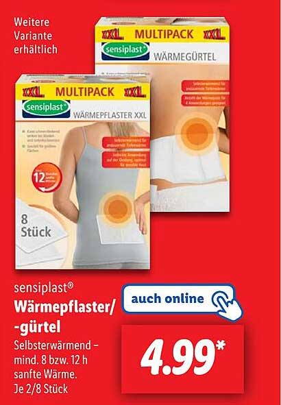 Entdecken Sie das großartige Sensiplast® Wärmepflaster/-Gürtel Angebot im neuesten Lidl Prospekt. Neben diesem Angebot finden Sie noch viele weitere attraktive Rabatte. Sie können das Sensiplast® Wärmepflaster/-Gürtel einfach online über die Lidl Website bestellen oder in einem Geschäft in Ihrer Nähe kaufen.