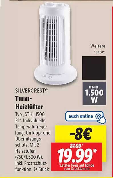 Sehen Sie sich das Silvercrest® Turm-Heizlüfter Angebot bei Lidl an! Dieses fantastische Angebot ist jetzt im neuesten Lidl Prospekt verfügbar. Nutzen Sie diese Chance und sparen Sie viel bei Ihrem Einkauf.