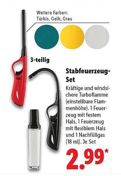 Auf der Suche nach einem praktischen und zuverlässigen Feuerzeug-Set? Dieses Stabfeuerzeug-Set, das vom 10. bis 15. November 2025 in Angeboten zu finden ist, könnte genau das sein, was du brauchst. Es umfasst zwei verschiedene Feuerzeuge – eines mit festem Hals und eines mit flexiblem Hals – sowie eine Nachfüllflasche mit 18 ml. Ideal für alle, die regelmäßig Feuer benötigen, sei es zum Grillen, für Kerzen oder andere Anwendungen.