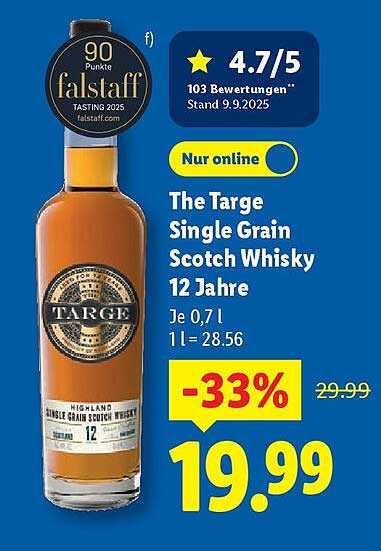 Sehen Sie sich jetzt das The Targe Single Grain Scotch Whisky 12 Jahre Angebot im Lidl Prospekt an. Dieses Angebot ist gültig von 29.09.2025 bis 04.10.2025.