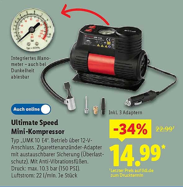 Sehen Sie sich jetzt das Ultimate Speed Mini-Kompressor - Typ „UMK 10 E4“ Angebot im Lidl Prospekt an. Dieses Angebot ist gültig von 22.09.2025 bis 28.09.2025.
