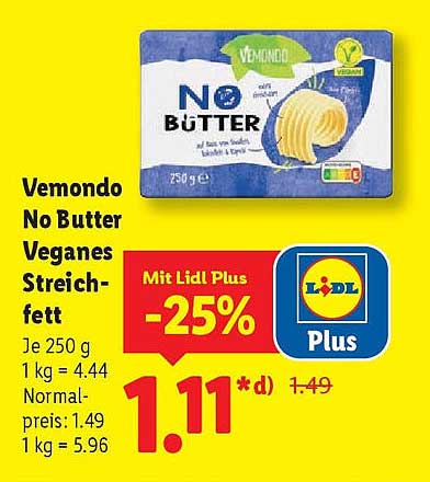 Sehen Sie sich jetzt das Vemondo No Butter Veganes Streichfett 250 g Angebot im Lidl Prospekt an. Dieses Angebot ist gültig von 27.10.2025 bis 01.11.2025.