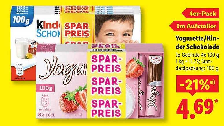 Sehen Sie sich jetzt das Yogurette/Kinder Schokolade 4er-Pack Angebot im Lidl Prospekt an. Dieses Angebot ist gültig von 27.10.2025 bis 01.11.2025.