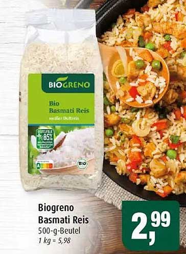 Sehen Sie sich jetzt das Biogreno Basmati Reis 500-g-Beutel Angebot im Markant Prospekt an. Dieses Angebot ist gültig von 30.06.2025 bis 05.07.2025.