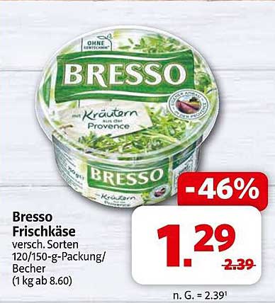 Entdecken Sie den köstlichen Bresso Frischkäse, der Ihre Gerichte auf ein neues Geschmacksniveau hebt! Ob auf dem Frühstückstisch, als Snack zwischendurch oder als Zutat in Ihrer Lieblingsspeise, dieser Frischkäse mit Kräutern aus der Provence ist eine großartige Wahl. Der aktuelle Preis von nur 1,29 € macht es noch einfacher, sich diesen Genuss zu gönnen!