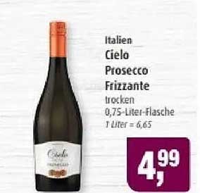 Sehen Sie sich jetzt das Cielo Prosecco Frizzante trocken 0,75-Liter-Flasche Angebot im Markant Prospekt an. Dieses Angebot ist gültig von 20.10.2025 bis 25.10.2025.