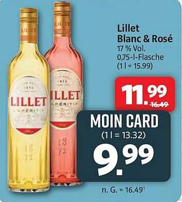 Der reguläre Preis für Lillet Blanc & Rosé liegt bei 16,49 €. Aktuell erhalten Sie die Flasche für nur 9,99 € mit Moin Card (regulär 11,99 €). Dies entspricht einer erheblichen Ersparnis, die Sie nicht verpassen sollten!