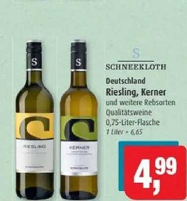 Sehen Sie sich jetzt das Schneekloht Deutschland Riesling und Kerner Qualitätsweine 0,75-Liter-Flasche Angebot im Markant Prospekt an. Dieses Angebot ist gültig von 13.10.2025 bis 18.10.2025.