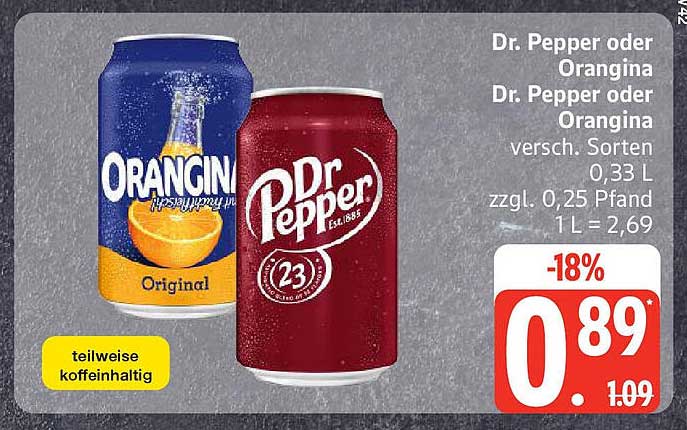 Dr. Pepper und Orangina kommen in praktischen 0,33 L Dosen, die nicht nur handlich sind, sondern auch durch ihre Frische überzeugen. Beide Getränke enthalten Kohlensäure und sind teilweise koffeinhaltig, um Ihnen einen kleinen Energieschub zu geben.
