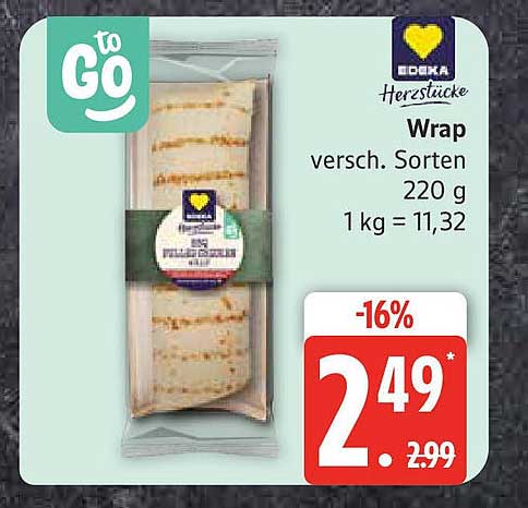 Aktuell erhalten Sie den EDEKA Herstück Wrap zum Einführungspreis von nur 2,49 €, was einem Rabatt von 16% entspricht. Im Vergleich zum regulären Preis von 2,99 € profitieren Sie hier von einer tollen Ersparnis. So wird das Genießen dieser leckeren Wraps noch einfacher und attraktiver.