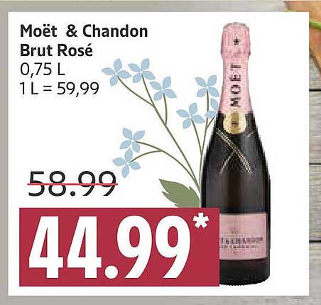 Der reguläre Preis für Moët & Chandon Brut Rosé liegt bei 58,99 €, doch während der Aktionszeit vom 06. bis 12. April 2025 erhalten Sie ihn zum sensationellen Preis von nur 44,99 €. Dies entspricht einer Ersparnis von über 24%, was dieses Angebot besonders attraktiv macht.