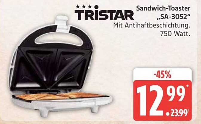 Sehen Sie sich jetzt das Sandwich-Toaster „SA-3052“ von Tristar mit Antihaftebeschichtung Angebot im Marktkauf Prospekt an. Dieses Angebot ist gültig von 16.06.2025 bis 21.06.2025.