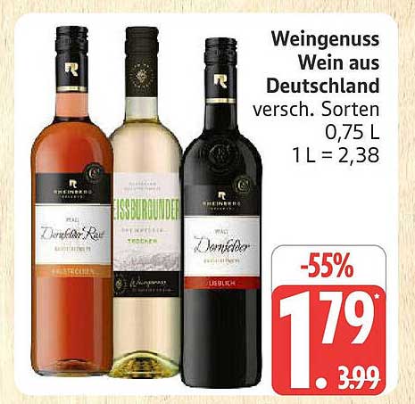 Dieses Angebot zeigt eine bemerkenswerte Ersparnis von 55%! Der aktuelle Preis von nur 1,79 € pro Flasche im Vergleich zum regulären Preis von 3,99 € ist ein echtes Schnäppchen. Nutzen Sie die Gelegenheit, um in den Genuss dieser großartigen Weine zu kommen und gleichzeitig Geld zu sparen.