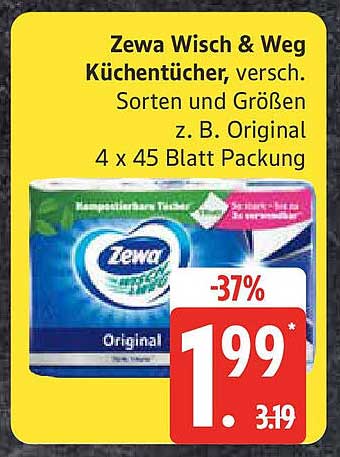 Möchten Sie sofort informiert werden, sobald das Zewa Wisch & Weg Küchentücher, Versch. Sorten Und Größen im Angebot ist? Melden Sie sich für unsere Angebots-Benachrichtigungen an. So erhalten Sie eine Benachrichtigung, sobald das Produkt zu einem günstigen Preis verfügbar ist.