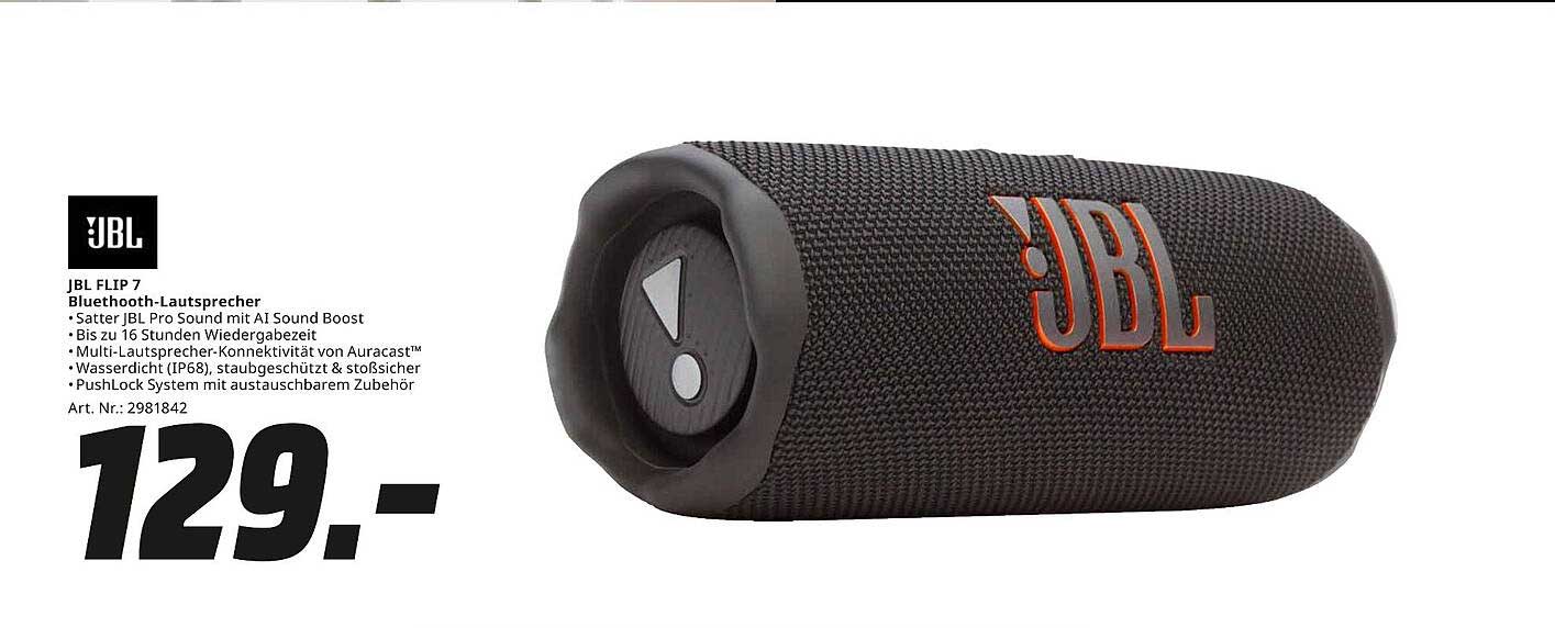 Sehen Sie sich jetzt das JBL FLIP 7 - Bluetooth-Lautsprecher Angebot im MediaMarkt Prospekt an. Dieses Angebot ist gültig von 21.07.2025 bis 26.07.2025.