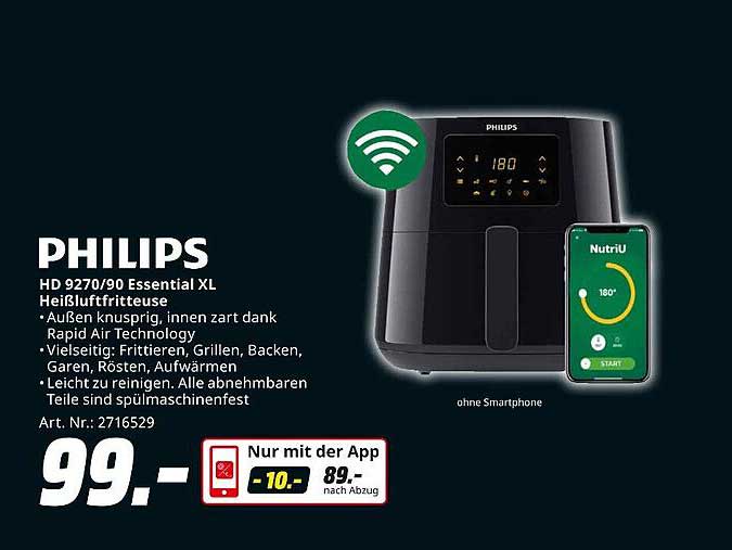 Sehen Sie sich jetzt das PHILIPS HD 9270/90 Essential XL Heißluftfriteuse Angebot im MediaMarkt Prospekt an. Dieses Angebot ist gültig von 24.03.2025 bis 07.04.2025.