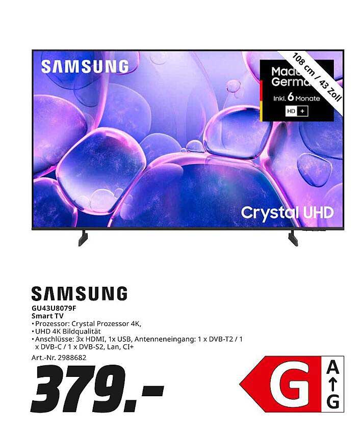Der normale Verkaufspreis des Samsung GU43U8079F liegt bei 379,- Euro. Im aktuellen MediaMarkt-Angebot zahlen Sie jedoch nur 379,- Euro, was bedeutet, dass Sie hier die Gelegenheit haben, in die Welt des 4K-Fernsehens einzutauchen, ohne Ihr Budget zu sprengen. Ein unschlagbares Preis-Leistungs-Verhältnis!