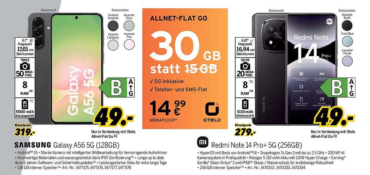 Entdecken Sie jetzt das unschlagbare Smartphone-Angebot bei MEDIMAX! Sowohl das Samsung Galaxy A56 5G als auch das Redmi Note 14 Pro+ 5G sind für kurze Zeit zum attraktiven Preis von nur 49,00 € erhältlich, wenn Sie sich für die Otelo Allnet-Flat Go entscheiden. Dieses Angebot ist nicht nur preiswert, sondern bietet auch erstklassige Mobilfunkleistungen.