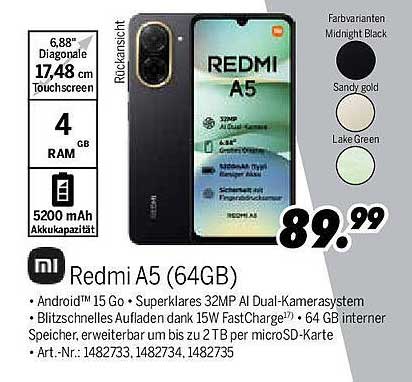 Wenn du auf der Suche nach einem leistungsstarken Smartphone bist, das sowohl hochwertig als auch budgetfreundlich ist, dann ist das Xiaomi Redmi A5 genau das Richtige für dich. Dieses Angebot, das vom 15. Mai bis zum 22. Mai 2025 gültig ist, gibt dir die Möglichkeit, ein erstklassiges Gerät zu einem attraktiven Preis von nur 89,99 € zu erwerben. Es kombiniert modernste Technologie mit einem ansprechenden Design und bietet dir alles, was du von einem Smartphone erwartest.