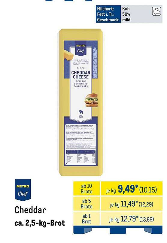 Sehen Sie sich jetzt das Cheddar Käse Block – ca. 2,5-kg-Brot Angebot im METRO Prospekt an. Dieses Angebot ist gültig von 13.10.2025 bis 19.10.2025.