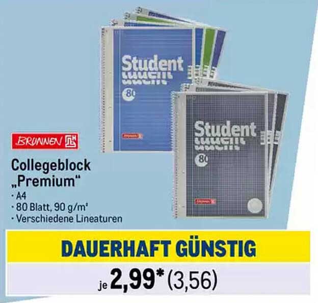 Sehen Sie sich das Collegeblock „Premium“ Angebot bei METRO an! Dieses fantastische Angebot ist jetzt im neuesten METRO Prospekt verfügbar. Nutzen Sie diese Chance und sparen Sie viel bei Ihrem Einkauf.