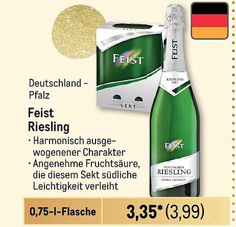 Sehen Sie sich jetzt das Feist Riesling Angebot im METRO Prospekt an. Dieses Angebot ist gültig von 05.12.2024 bis 18.12.2024.
