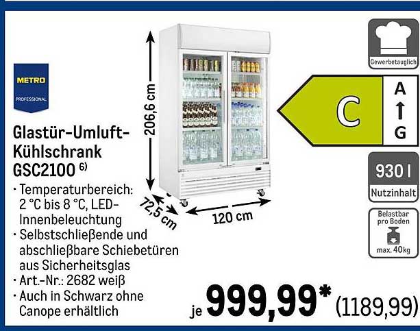 Aktuell ist der GSC2100 für 999,99 € erhältlich, während der Normalpreis bei 1189,99 € liegt. Dies bedeutet eine Ersparnis von 190 € und macht dieses Angebot umso attraktiver für Gewerbetreibende, die auf der Suche nach einem hochwertigen Kühlschrank sind.