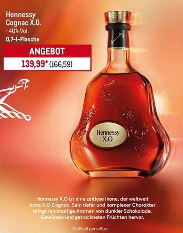 Sehen Sie sich jetzt das Hennessy Cognac X.O. 0,7 l-Flasche Angebot im METRO Prospekt an. Dieses Angebot ist gültig von 03.11.2025 bis 08.11.2025.