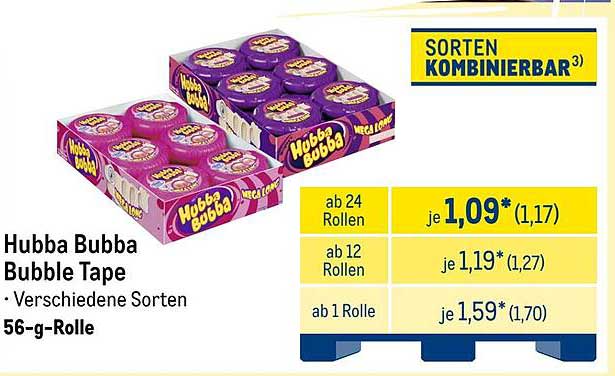 Sehen Sie sich jetzt das Hubba Bubba Bubble Tape - Verschiedene Sorten Angebot im METRO Prospekt an. Dieses Angebot ist gültig von 20.10.2025 bis 26.10.2025.