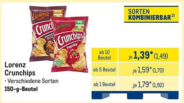 Sehen Sie sich jetzt das Lorenz Crunchips - Verschiedene Sorten 150-g-Beutel Angebot im METRO Prospekt an. Dieses Angebot ist gültig von 20.10.2025 bis 26.10.2025.