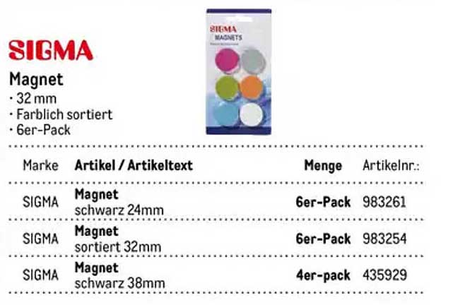 Sehen Sie sich jetzt das Magnet 32 mm Farblich sortiert 6er-Pack Angebot im METRO Prospekt an. Dieses Angebot ist gültig von 31.12.2024 bis 07.01.2025.