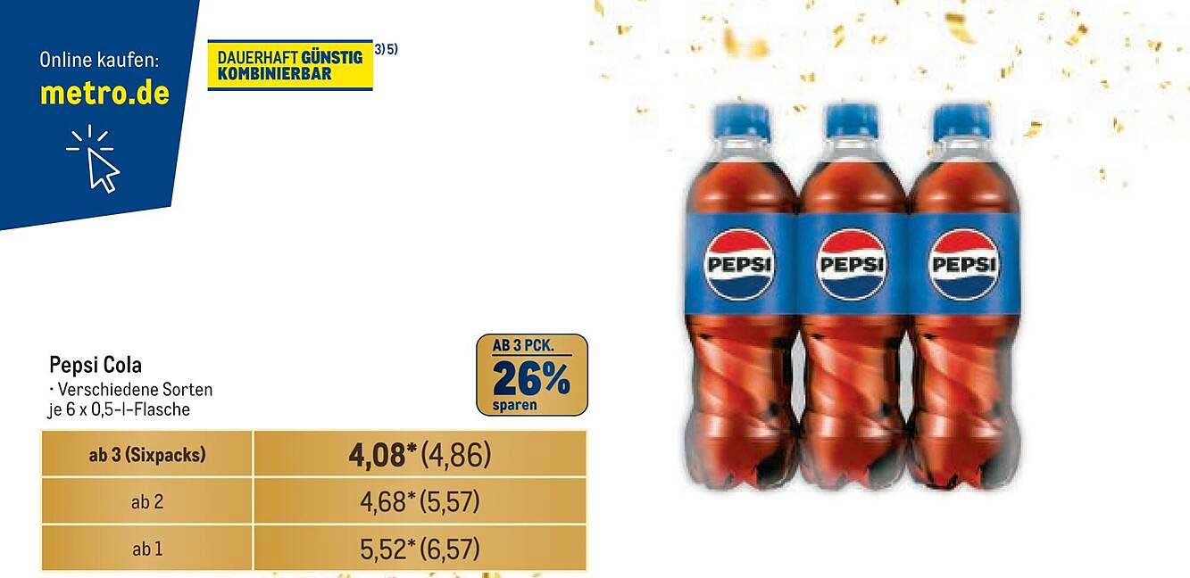 Sehen Sie sich das Pepsi Cola Angebot bei METRO an! Dieses fantastische Angebot ist jetzt im neuesten METRO Prospekt verfügbar. Nutzen Sie diese Chance und sparen Sie viel bei Ihrem Einkauf.