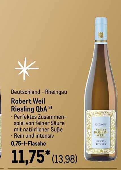 Sehen Sie sich jetzt das Robert Weil Riesling QbA 0,75 l-Flasche Angebot im METRO Prospekt an. Dieses Angebot ist gültig von 01.11.2025 bis 31.12.2025.