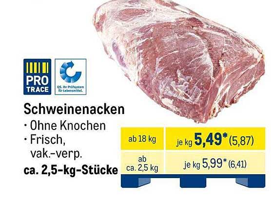 Sehen Sie sich jetzt das Schweinenacken - ohne Knochen, frisch und vakuumverpackt Angebot im METRO Prospekt an. Dieses Angebot ist gültig von 22.09.2025 bis 27.09.2025.