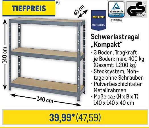 Sehen Sie sich das Schwerlastregal „Kompakt“ Angebot bei METRO an! Dieses fantastische Angebot ist jetzt im neuesten METRO Prospekt verfügbar. Nutzen Sie diese Chance und sparen Sie viel bei Ihrem Einkauf.