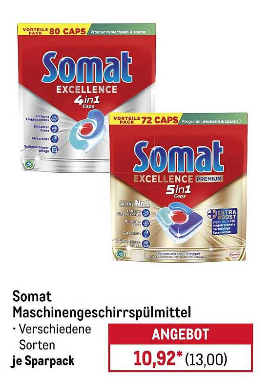 Sehen Sie sich jetzt das Somat Excellence Maschinengeschirrspülmittel 4in1 und 5in1 je Sparpack Angebot im METRO Prospekt an. Dieses Angebot ist gültig von 13.10.2025 bis 19.10.2025.