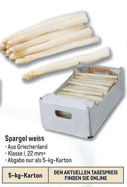 Sehen Sie sich jetzt das Spargel weiss aus Griechenland – Klasse I, 22 mm+ im 5-kg-Karton Angebot im METRO Prospekt an. Dieses Angebot ist gültig von 10.04.2025 bis 23.04.2025.