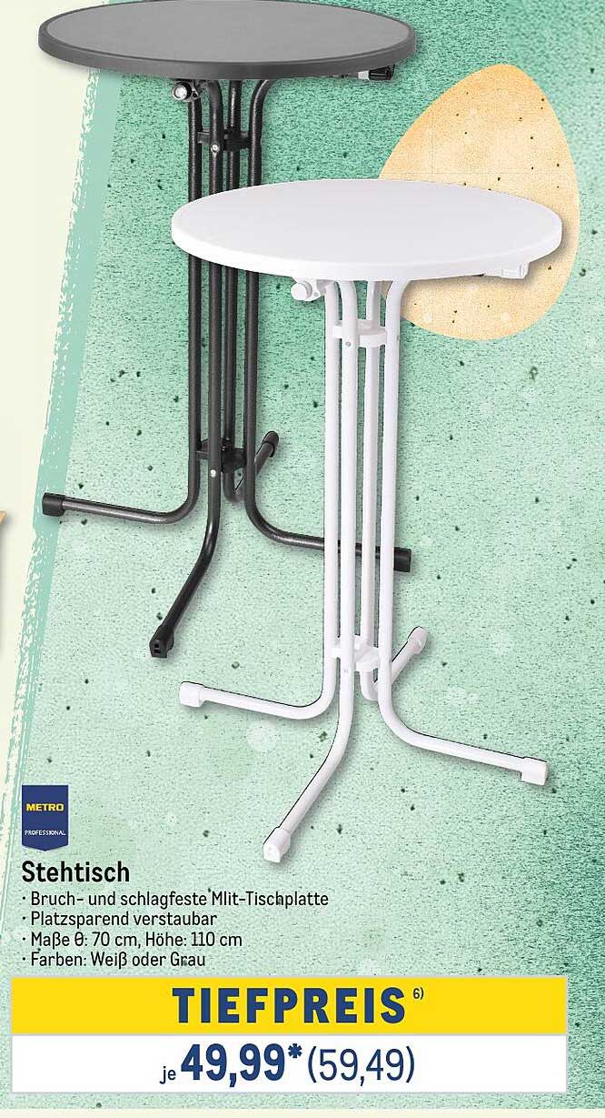 Der Stehtisch aus dem METRO-Prospekt bietet Ihnen eine hervorragende Möglichkeit, Ihren Raum funktional und ästhetisch zu gestalten. Ideal für Feiern, Veranstaltungen oder einfach nur für einen entspannten Abend mit Freunden!