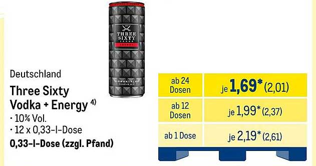 Sehen Sie sich jetzt das Three Sixty Vodka + Energy 0,33 l-Dose Angebot im METRO Prospekt an. Dieses Angebot ist gültig von 22.09.2025 bis 28.09.2025.