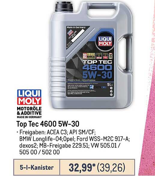 Das Angebot für den Top Tec 4600 5W-30 Motorölkanister von LIQUI MOLY ist ein unschlagbares Schnäppchen für alle Autofahrer, die Wert auf Qualität und Leistung legen. Dieses hochwertige Motoröl ist ideal für zahlreiche Fahrer und eignet sich besonders für moderne Pkw mit Benzin- und Dieselmotoren. Gut zu wissen: Das Angebot ist gültig vom 27. März bis 8. April 2025, also schnell zuschlagen, solange der Vorrat reicht!