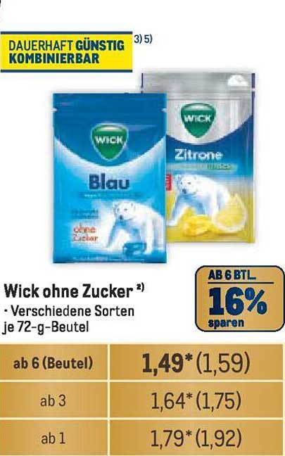 Sehen Sie sich jetzt das Wick ohne Zucker Angebot im METRO Prospekt an. Dieses Angebot ist gültig von 02.10.2024 bis 16.10.2024.