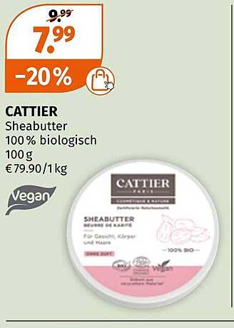 Sehen Sie sich das Cattier Sheabutter 100 % Biologisch Angebot bei Müller an! Dieses fantastische Angebot ist jetzt im neuesten Müller Prospekt verfügbar. Nutzen Sie diese Chance und sparen Sie viel bei Ihrem Einkauf.