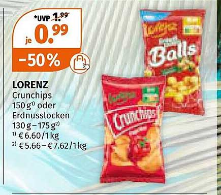 Entdecken Sie die leckeren Lorenz Crunchips und Erdnusslocken, die das perfekte Snackvergnügen bieten! Diese knusprigen Leckereien sind ideal für gesellige Abende, als kleine Belohnung nach einem langen Arbeitstag oder einfach nur zum Genießen für zwischendurch. Mit dem aktuellen Angebot bei Müller können Sie jetzt zum halben Preis zuschlagen und sich den Genuss gönnen.