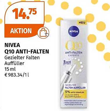 Sehen Sie sich das Nivea Q10 Anti-Falten Gezielter Falten Auffüller Angebot bei Müller an! Dieses fantastische Angebot ist jetzt im neuesten Müller Prospekt verfügbar. Nutzen Sie diese Chance und sparen Sie viel bei Ihrem Einkauf.