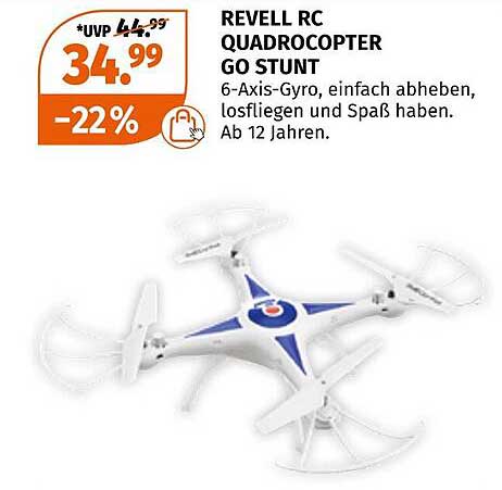 Sehen Sie sich das Revell Rc Quadcopter Go Stunt Angebot bei Müller an! Dieses fantastische Angebot ist jetzt im neuesten Müller Prospekt verfügbar. Nutzen Sie diese Chance und sparen Sie viel bei Ihrem Einkauf.