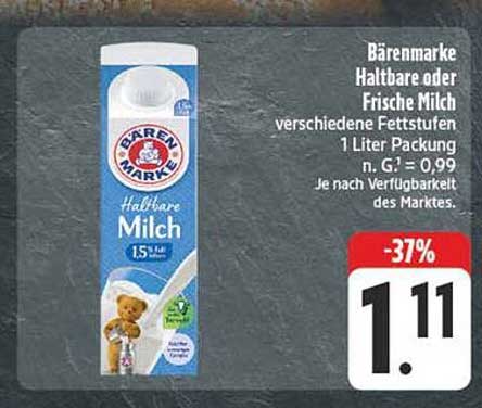 Profitieren Sie von einem sensationellen Angebot: Statt 1,11 € zahlen Sie nur 0,99 € für die Bärenmarke Milch. Das entspricht einer Ersparnis von über 37%! Solch ein Preis-Leistungs-Verhältnis finden Sie selten, weshalb Sie sich schnell entscheiden sollten, um das Angebot nicht zu verpassen.