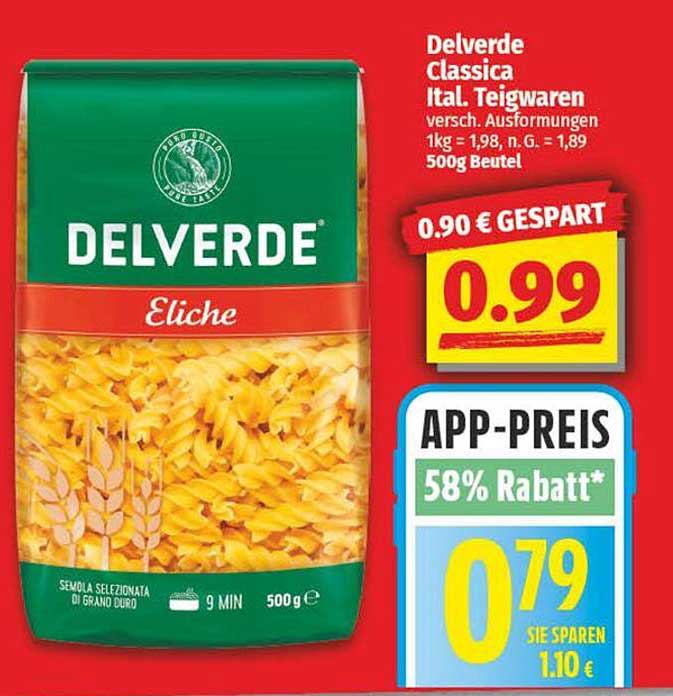 Das Angebot umfasst eine Ersparnis von 0,90 €, sodass Sie die Delverde Eliche zum Preis von nur 0,99 € statt des regulären Preises von 1,89 € erwerben können. Wenn Sie die App nutzen, profitieren Sie von einem speziellen Preis von nur 0,79 €, was einem Rabatt von 58% entspricht. So günstig war es noch nie, die köstlichen Teigwaren zu genießen!