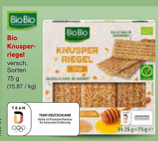 Sehen Sie sich jetzt das Bio Knusperriegel verschiedene Sorten 75 g Angebot im Netto Marken-Discount Prospekt an. Dieses Angebot ist gültig von 27.10.2025 bis 01.11.2025.