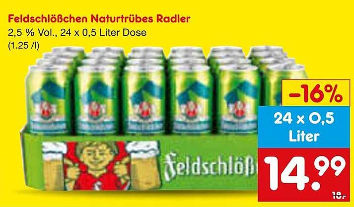 Sehen Sie sich jetzt das Feldschlößchen Naturtrübes Radler 2,5 % Vol., 24 x 0,5 Liter Dose Angebot im Netto Marken-Discount Prospekt an. Dieses Angebot ist gültig von 01.09.2025 bis 06.09.2025.